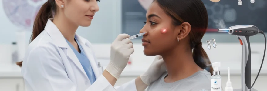 Les injections intralésionnelles de corticostéroïdes, en particulier la triamcinolone acétonide, constituent le pilier du traitement médical des chéloïdes post-piercing. La molécule agit comme un « frein » puissant sur les fibroblastes, réduisant la synthèse de collagène et l’inflammation locale. En pratique, le dermatologue injecte la suspension directement dans la masse chéloïdienne, à l’aide d’une aiguille fine, en répartissant le produit sur toute l’épaisseur de la lésion.